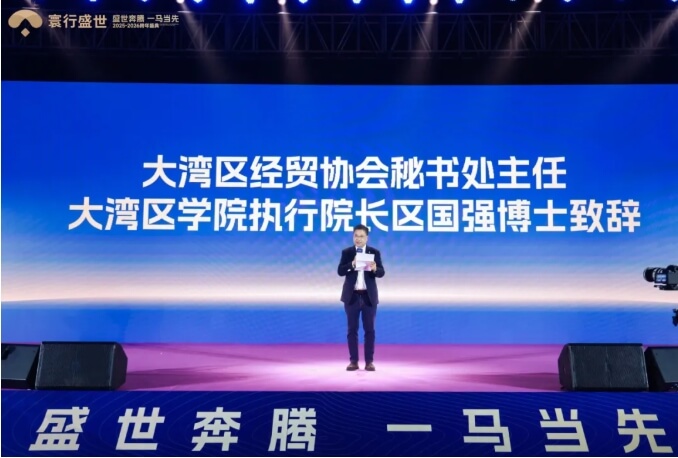 灯光渐柔,大湾区经贸协会及大湾区学院代表区国强院士登台致辞,充分肯定了寰行盛世的专业实力与全球化视野。