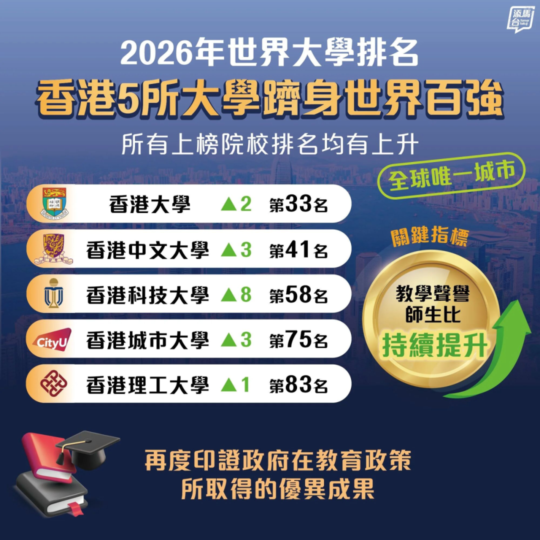 香港的高等教育享誉全球。在泰晤士高等教育2026年度世界大学排名中,香港成为全球唯一拥有五所大学跻身世界百强的城市,且所有上榜院校排名均有上升。