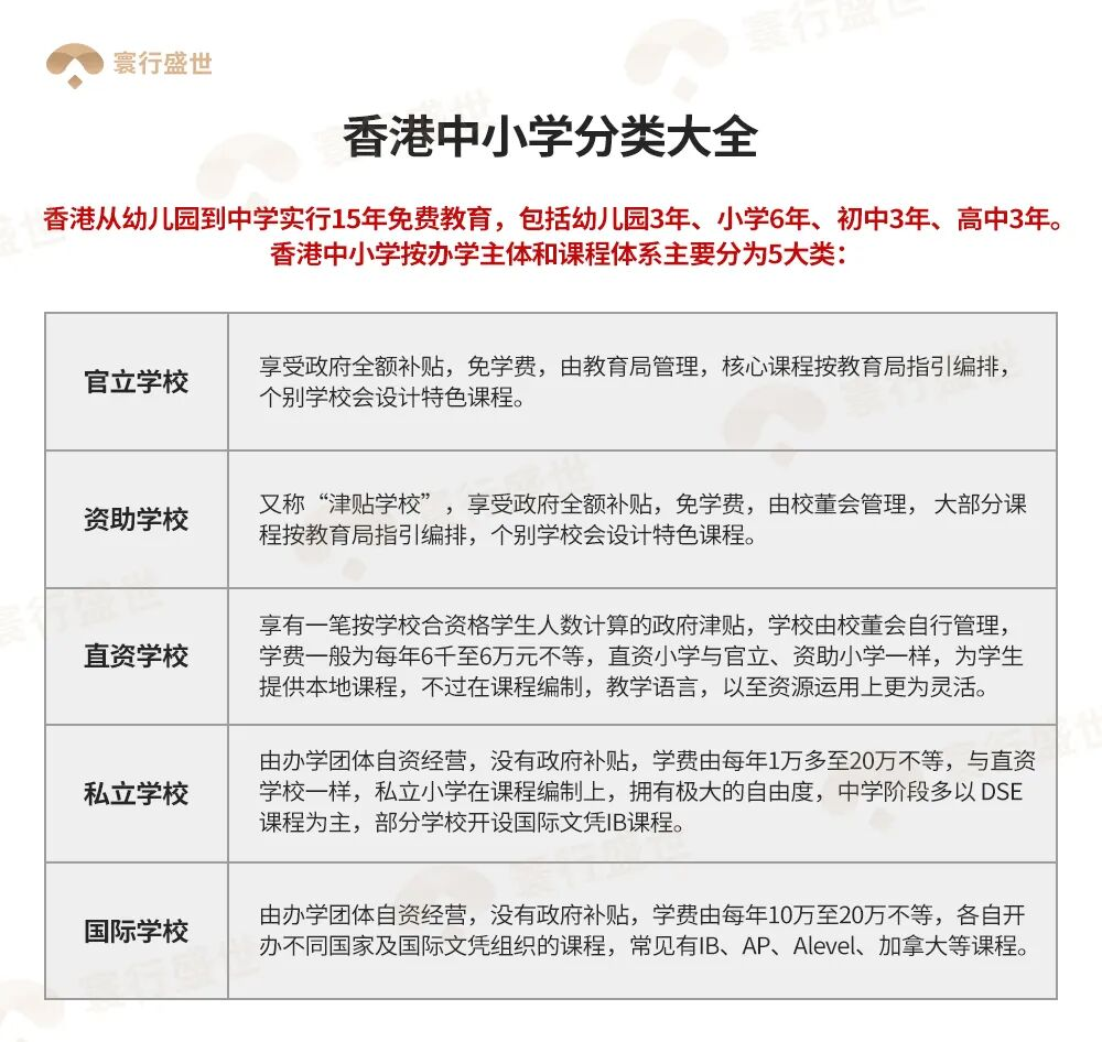 香港的中小学教育体系以多元化著称,主要分为官立学校、资助学校(又称“津贴学校”)、直资学校、私立学校以及国际学校五大类。