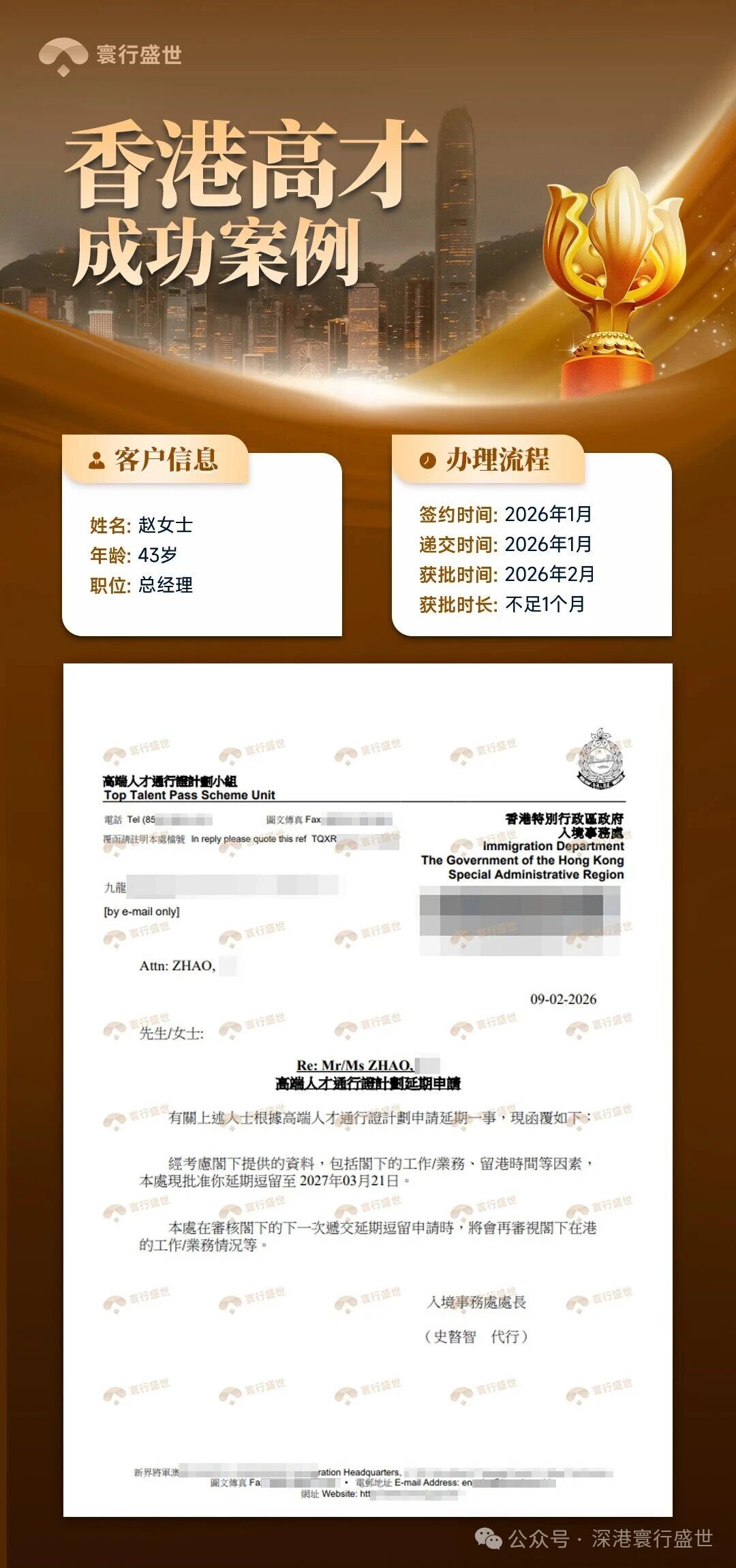 不久之后,好消息如期而至。从签约到正式获批,全程仅用时约一个月。即便在签证临期、商业材料有限的“劣势”开局下,寰行盛世凭借对政策的精准把握、高效的流程执行以及专业的文书撰写,清晰展示了客户与香港的未来联系,有效弥补了现有材料的不足,最终帮助客户顺利闯关成功。