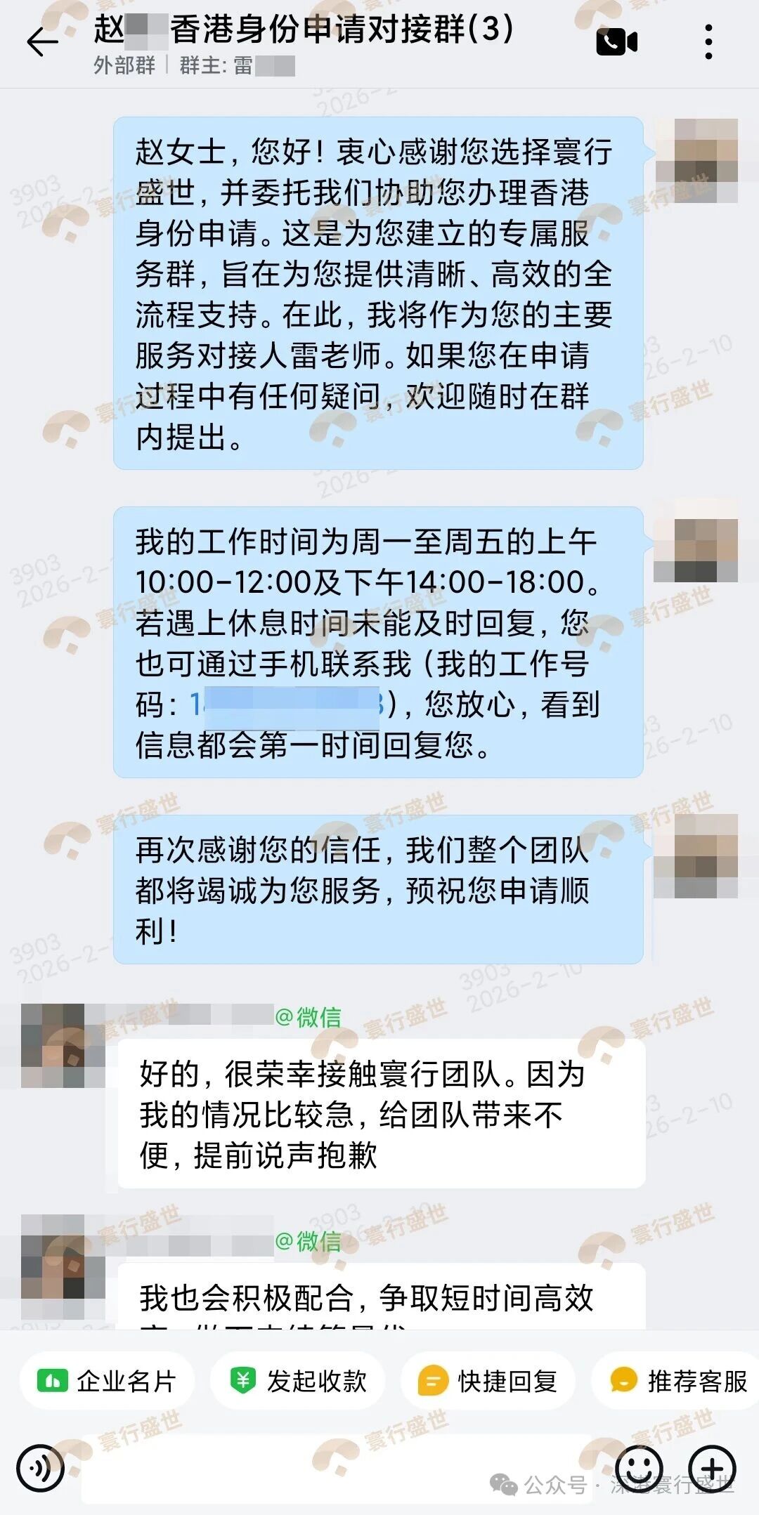 签约当日,专属服务群即刻建立,专属顾问清晰告知服务流程与时间。面对客户“情况较急”的歉意,团队回应:“感谢信任,我们会以最快速度给您办理。”