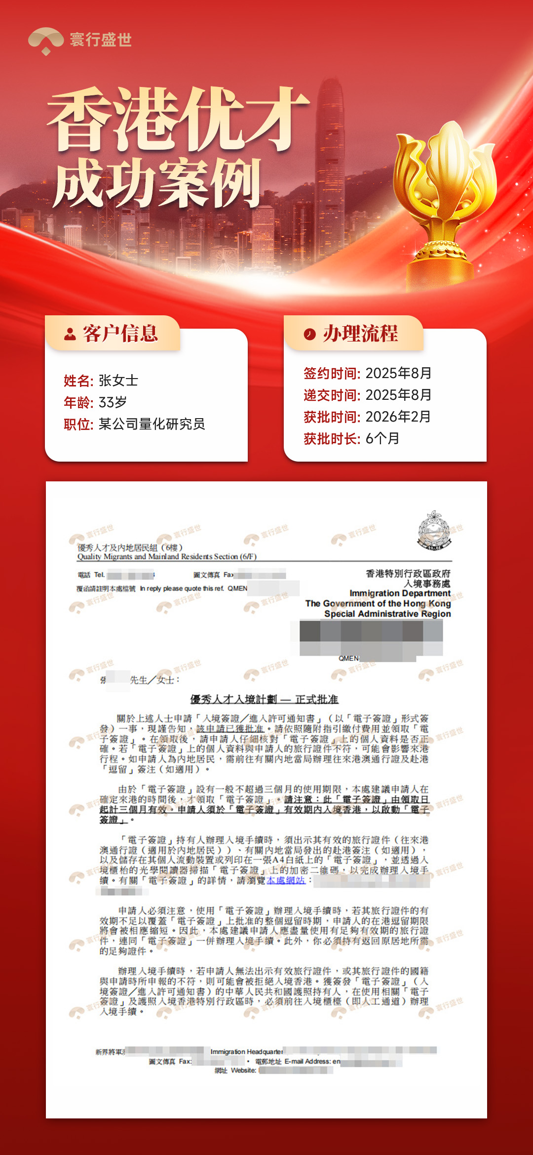 喜讯!恭喜张女士成功获得香港优才批准!在寰行盛世团队的帮助下,赵女士成功获批香港优才拿到香港身份!