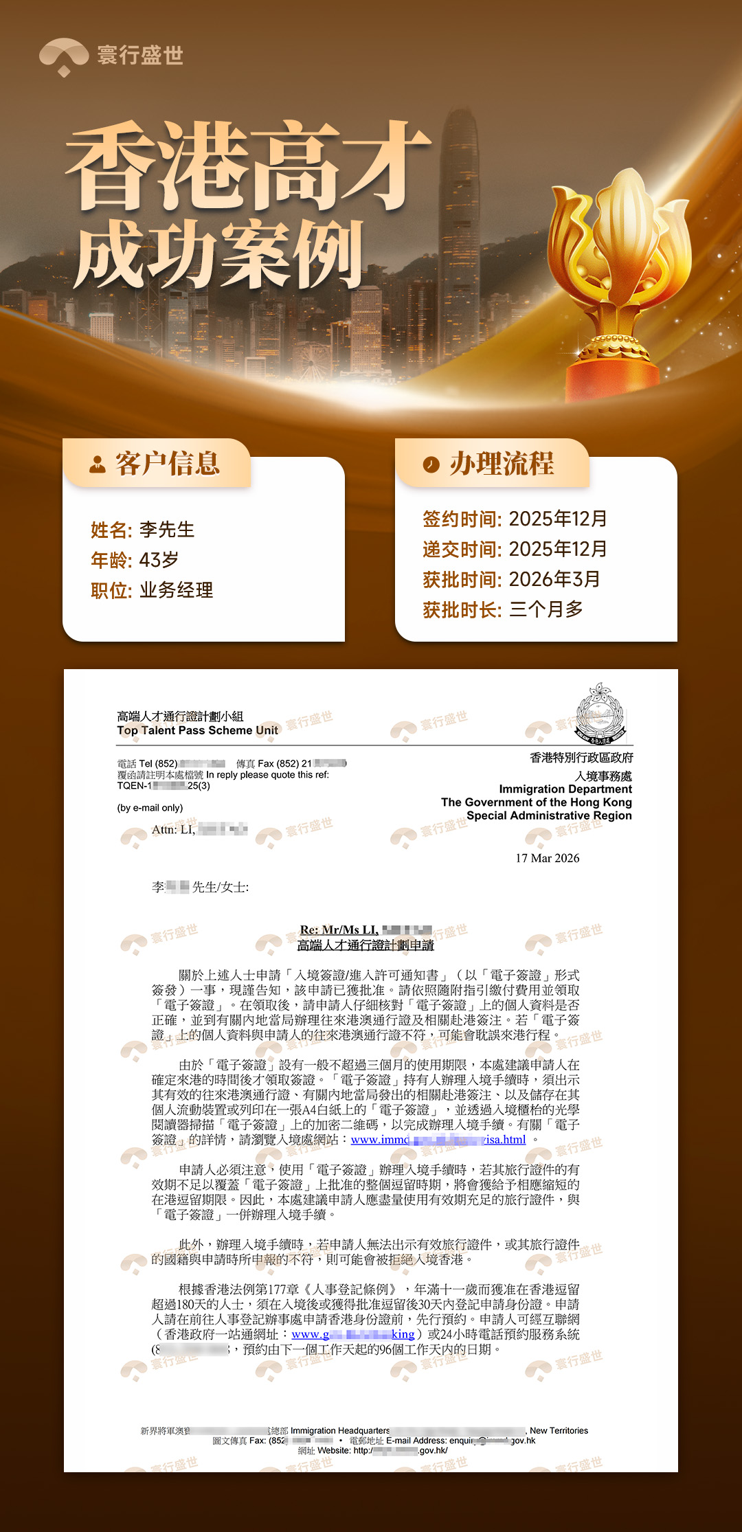 首先,恭喜我们的客户李先生通过香港高才通申请获批,拿到香港身份!